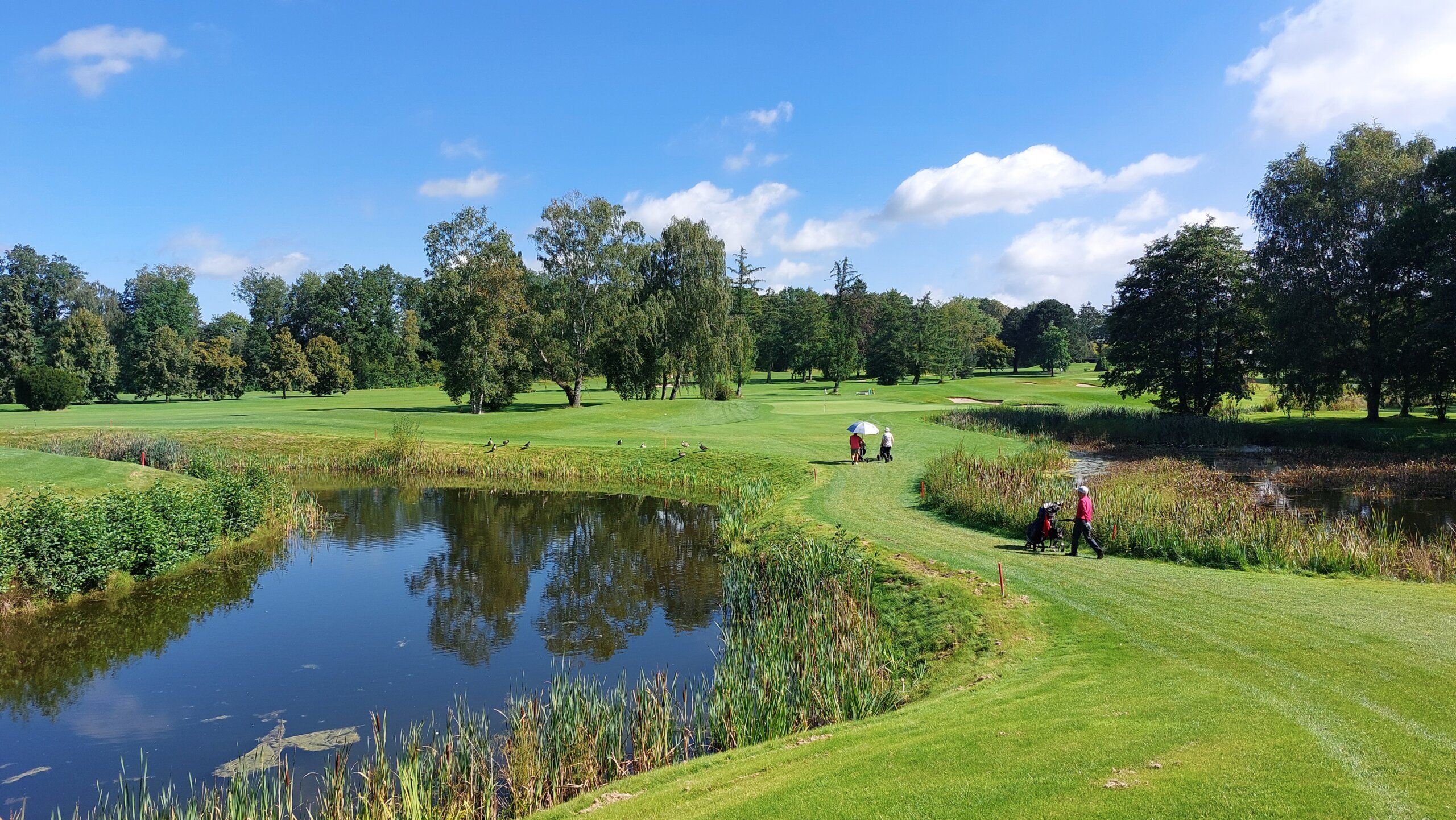 Bei der B6, einem kurzen Par 4 mit einem Dogleg nach links, wird der zweite Schlag über einen Teich gespielt. Wir dürfen dann über eine Brücke zum Grün gehen. Hier hatten wir einen Zusammenstoß mit einem Ganter. Schon beim Schlag über das Wasser griff er uns lautstark an. Kurz abwehren dann schnell spielen, Golfschläger können hier eine gewisse Sicherheit geben. Auch über die Brücke wollte der Ganter uns nicht lassen. Mir wurde berichtet, dass dort seine liebste Frau brütet und die Menschen dabei stören. Naja das habe ich dann verstanden, und wir hatten auch Glück, die nachfolgenden Damen wurden dann auch spannender für den zukünftigen Gänse-Papa.